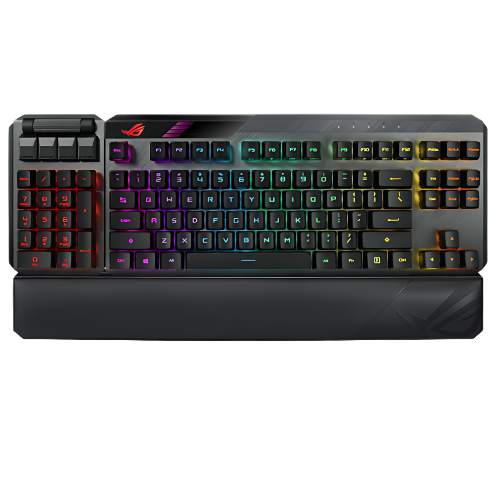 ROG Claymore II modular TKL gaming mechanical keyboard in UAE features a detachable numpad and wrist rest, ROG RX Optical Mechanical Switches, PBT doubleshot keycaps, lag-free connection, excellent battery life, fast charge, USB passthrough, intuitive control, wireless Aura Sync, and an ergonomic design. You may play the way you wish with the ROG Claymore II and enjoy comfort and precision during your gaming sessions.