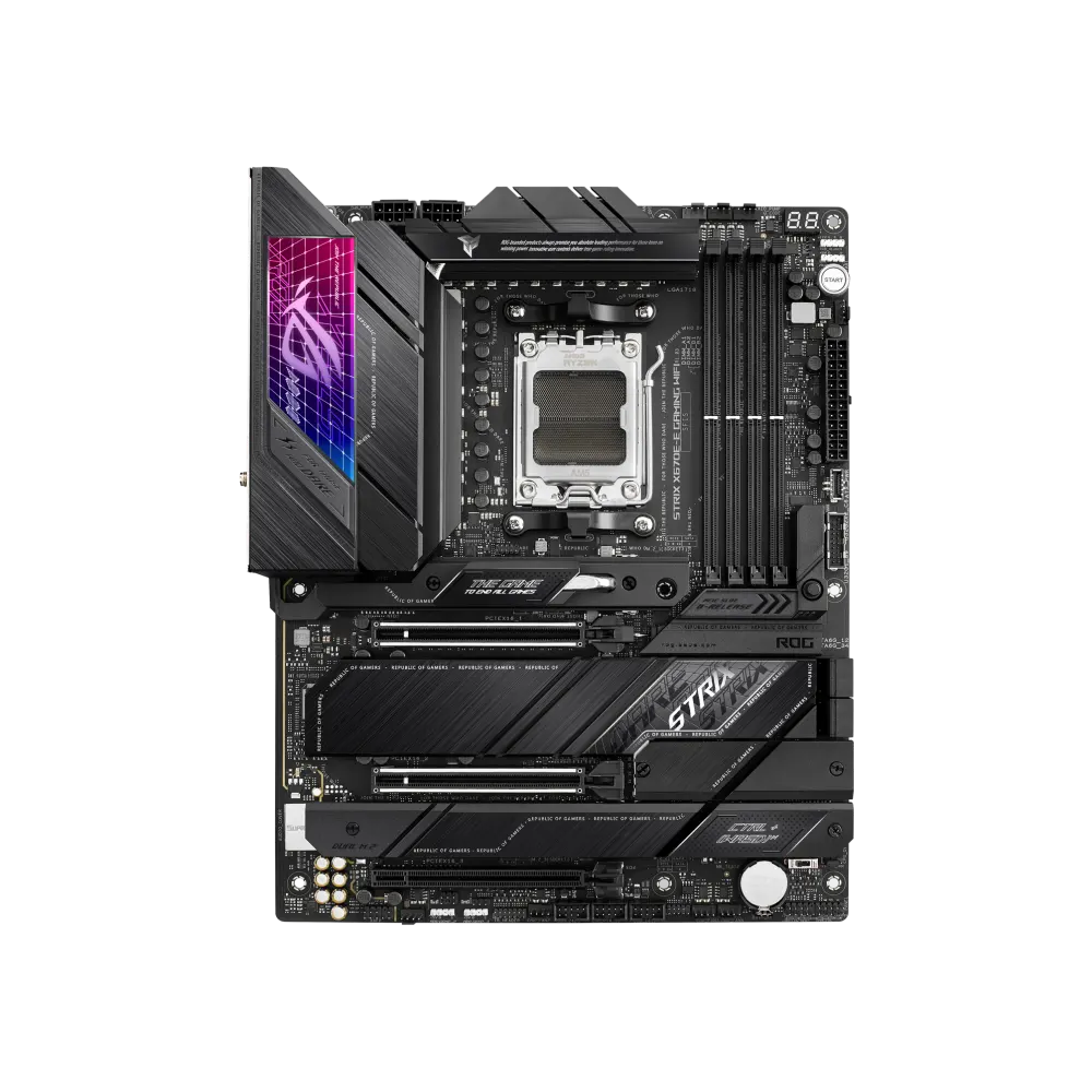 The ROG Strix X670E-E Gaming WiFi, the top model in the range, provides powerful power delivery and distinctive ROG overclocking features to optimise the performance of AMD RyzenTM 7000 Series CPUs. PCIe 5.0 supports the most powerful chipset capabilities, and a second huge heatsink is available to keep even the fastest M.2 drives cool. This Strix beast clutches AM5 and flies to triumph with leading performance, cutting-edge connectivity, and DIY-friendly features ranging from hardware installation to system configuration.