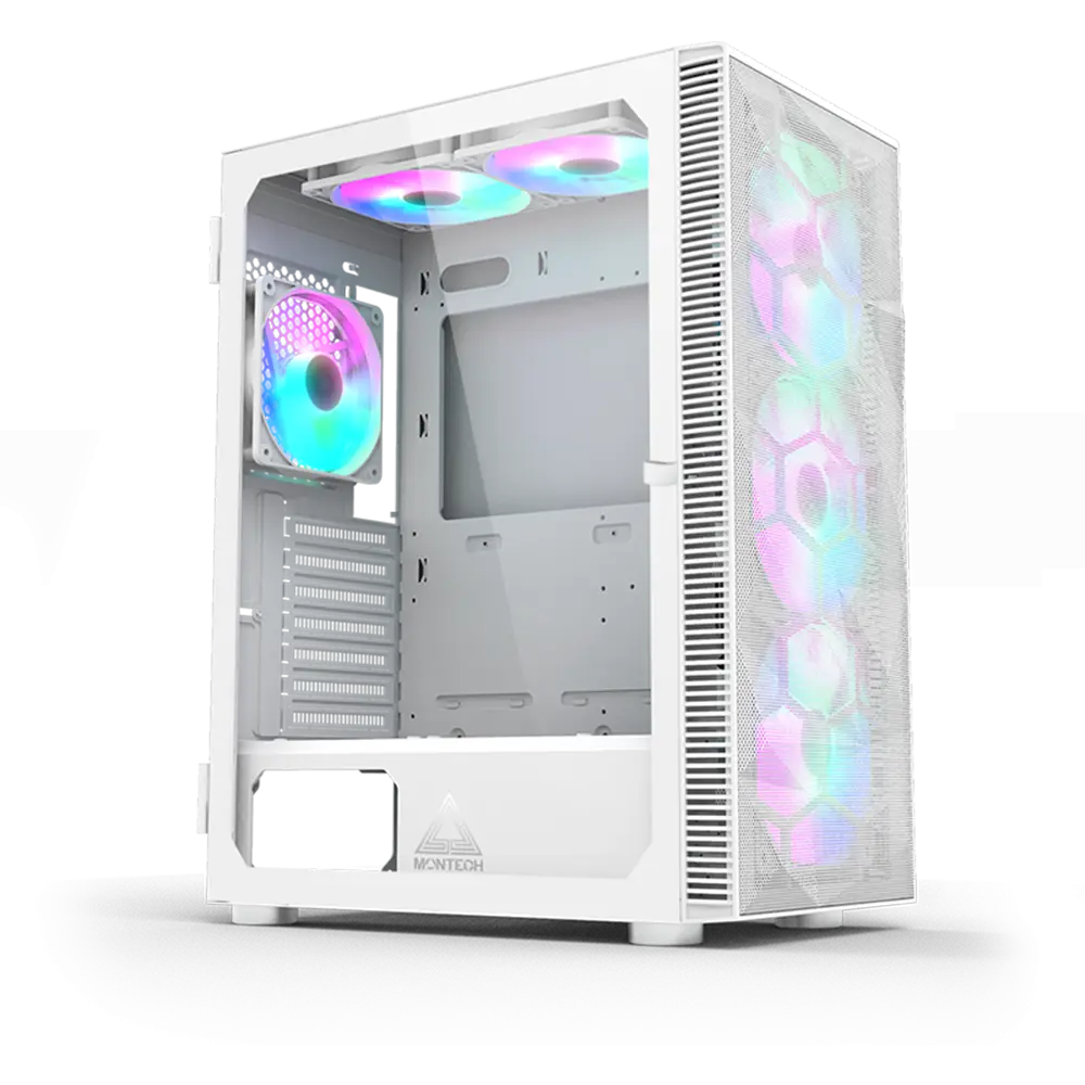 The Montech X3 Mesh RGB White Mid-Tower Gaming Case is set to revolutionize gaming setups in Saudi. With dimensions of 370 x 210 x 480mm and support for ATX, Micro ATX, and Mini ITX motherboards, it offers unmatched versatility. The case shines with its array of pre-installed fans, including three 140mm front fans, two 120mm top fans, and one 120mm rear fan, ensuring optimal cooling performance and captivating aesthetics.