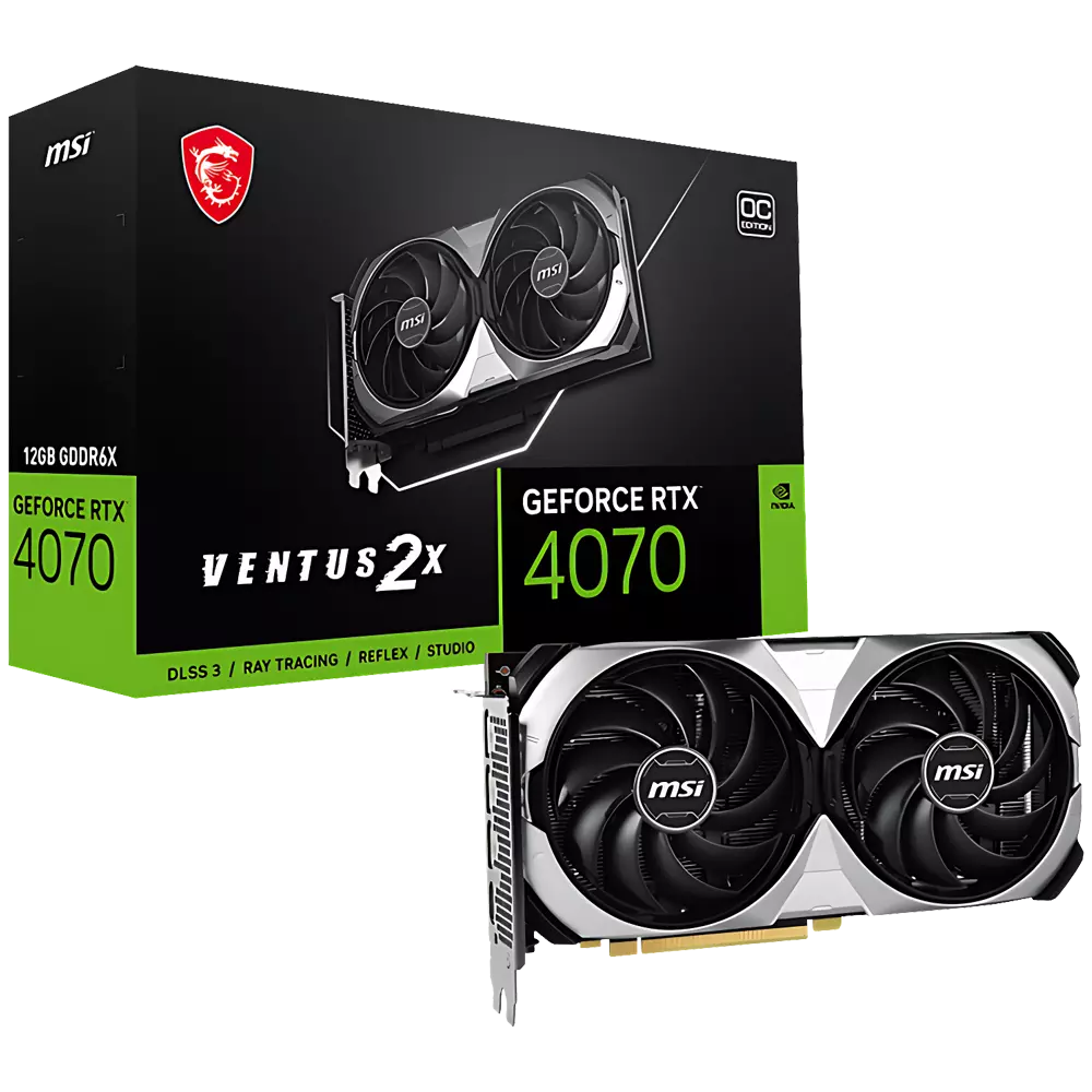MSI GeForce RTX 4070 Ventus 2X OC is equipped with NVIDIA® GeForce RTX™ 4070 GPU, 5888 CUDA® cores, 12GB GDDR6X memory, and supports up to 3 displays with G-Sync® technology.