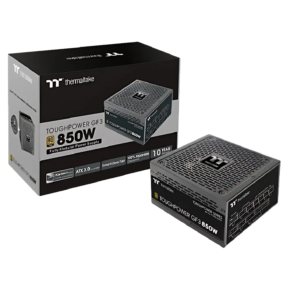 The Thermaltake Toughpower GF3 850W Gold - TT Premium Edition Power Supply is a completely modular, high-performance, and dependable power supply built for demanding customers who want clean and steady power for their systems. The Toughpower GF3 delivers great power efficiency and stability, even under severe loads, thanks to its ultra-quiet fan, precise voltage management, and superior Japanese capacitors.